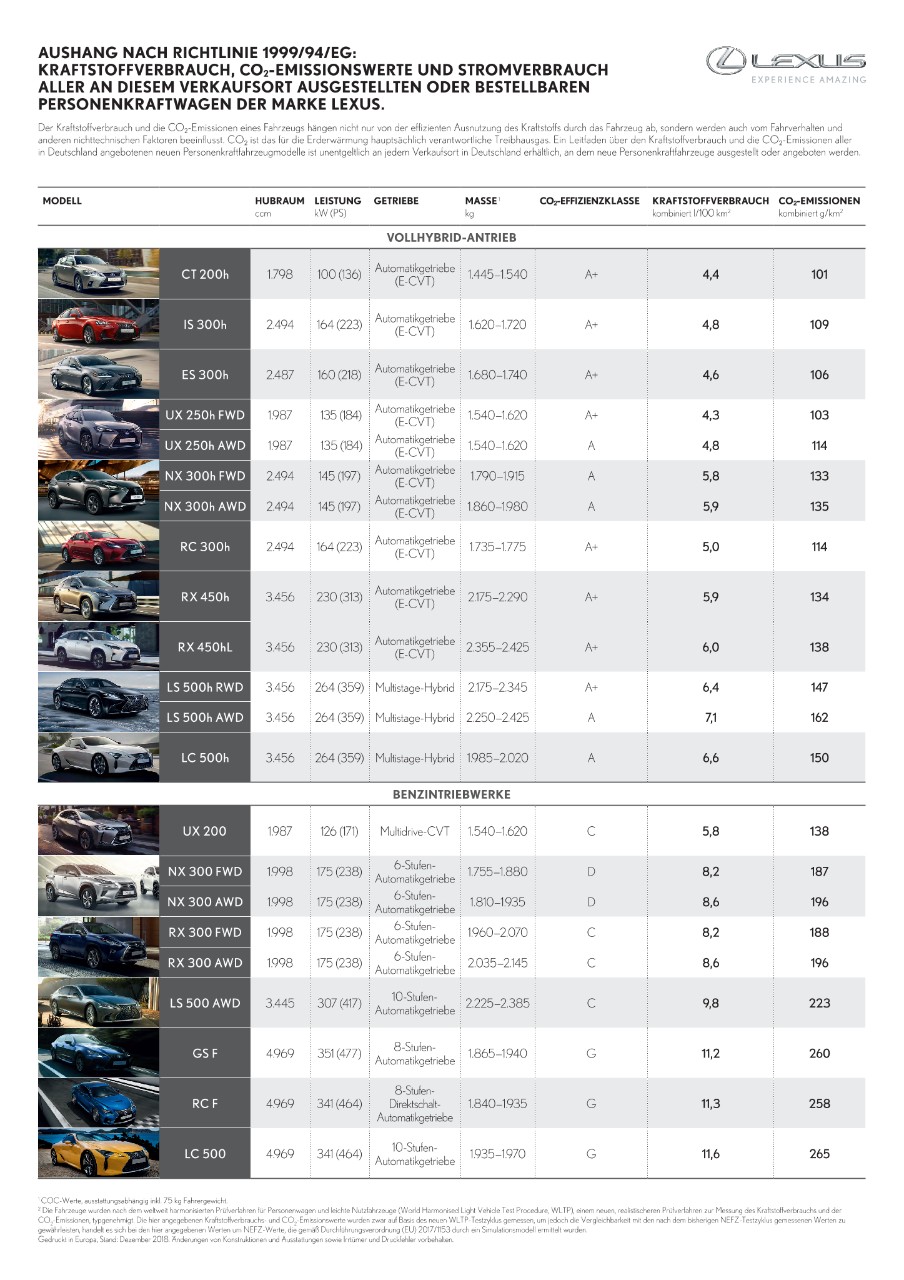 Informieren Sie sich über technische Details sämtlicher in Deutschland ausgestellten oder bestellbaren Lexus Modelle. Die Übersicht enthält u. a. Daten zu Hubraum, Leistung, Kraftstoffverbrauch und CO₂-Emission der einzelnen Modelle.